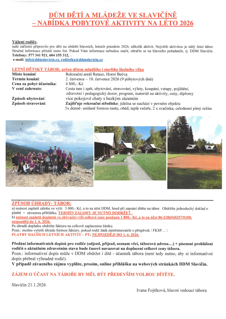 29.01.2026 POLOLETNÍ PŘÍMĚSTSKÝ TÁBOR S NÁZVEM, NOC A DEN V DDM JE PLNÝ ZÁBAVY, HER A SOUTĚŽÍ. NEBUDE TAKÉ CHYBĚT PYŽAMOVÁ PÁRTY, TAKŽE VŠICHNI SI POVINNĚ PŘINESOU PYŽAMO. ZAČÍNÁME VE ČTVRTEK V 17.30 A KONČÍME V PÁTEK 15.00H.. SVAČINKY, PITÍ A OBĚD JE ZAJIŠTĚN. POPLATEK 200 Kč. Akce je určena pro děti...
