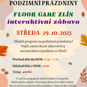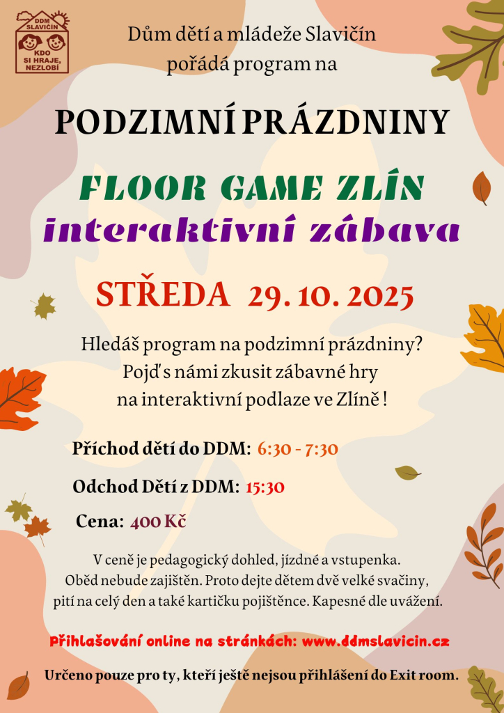 29.10.2025 PRÁZDNINOVÉ NENUDĚNÍ V DDM. PŘIPRAVEM BOHATÝ PROGRAM, S DĚTMI SI ZAJEDEME DO EXIT ROOM ZLÍN - ÚNIKOVÁ HRA. DĚTI SI PŘINESOU PITÍ A SVAČINY NA CELÝ DEN. OBĚD NENÍ ZAJIŠTĚN.