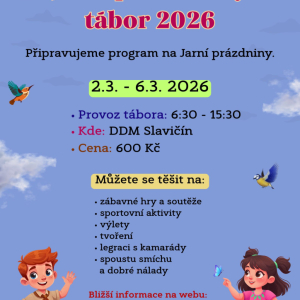02.03.2026 DĚTI ČEKÁ ZÁBAVNÝ TÝDEN JARNÍCH PRÁZDNIN. MŮŽOU SE TĚŠIT NA SEZNAMOVACÍ HRY A SPOUSTU VÝLETŮ. PROGRAM: 2.3. - ÚNIKOVÁ HRA V DDM 3.3. - OLOMOUC - KROKODÝLEK 4.3. - VIZOVICE - TVORBA ČOKOLÁDEK 5.3. - BRNO - BRUNO 6.3. - KINO, 3D TVOŘENÍ INFORMACE DLE VÝLETŮ BUDETE DOSTÁVAT KAŽDÝ DEN. O...